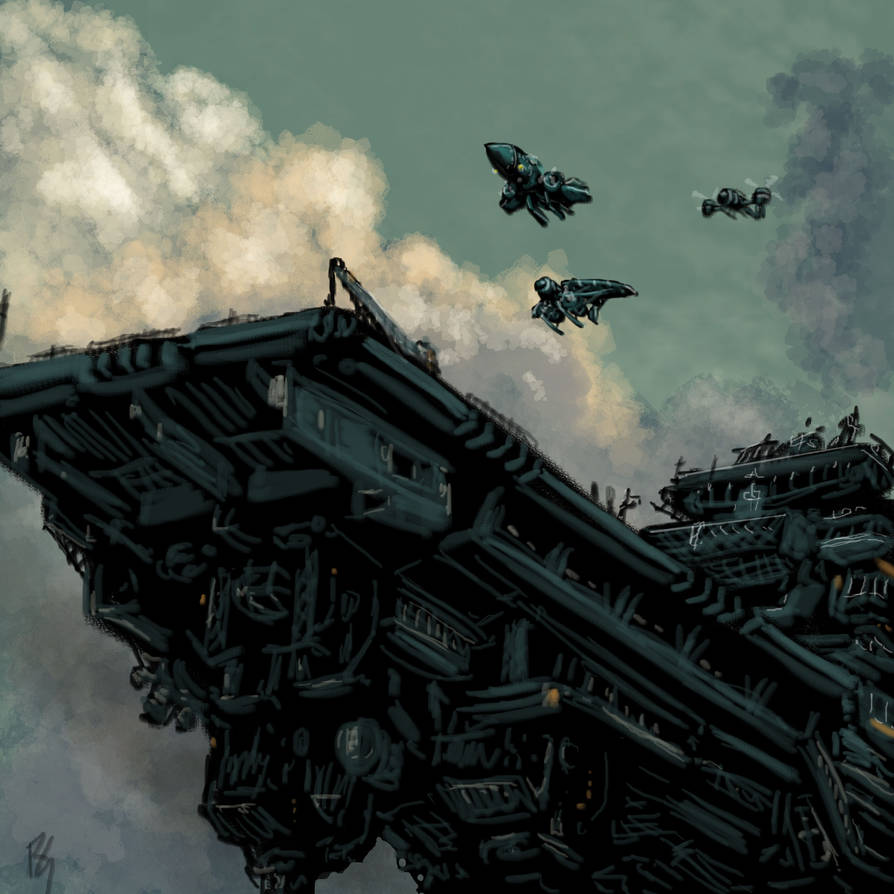 Greebles. So ... many ... greebles. There were a couple of "portraits" of the ATLUS available on the RP server, done by AI art (MidJourney, I'm guessing), without much in the way of consistency (because ... it's AI art). I tried drawing a scene of the machine, focusing on part of it that seemed to be a relatively consistent feature across the different depictions, drawing inspiration from the drawings, but not being entirely slavishly devoted to recreating them. I mean, if their own "canon" pictures don't agree with each other, I guess I shouldn't tie myself up in knots either. I added in a few gnomish flying craft to use the landing deck.