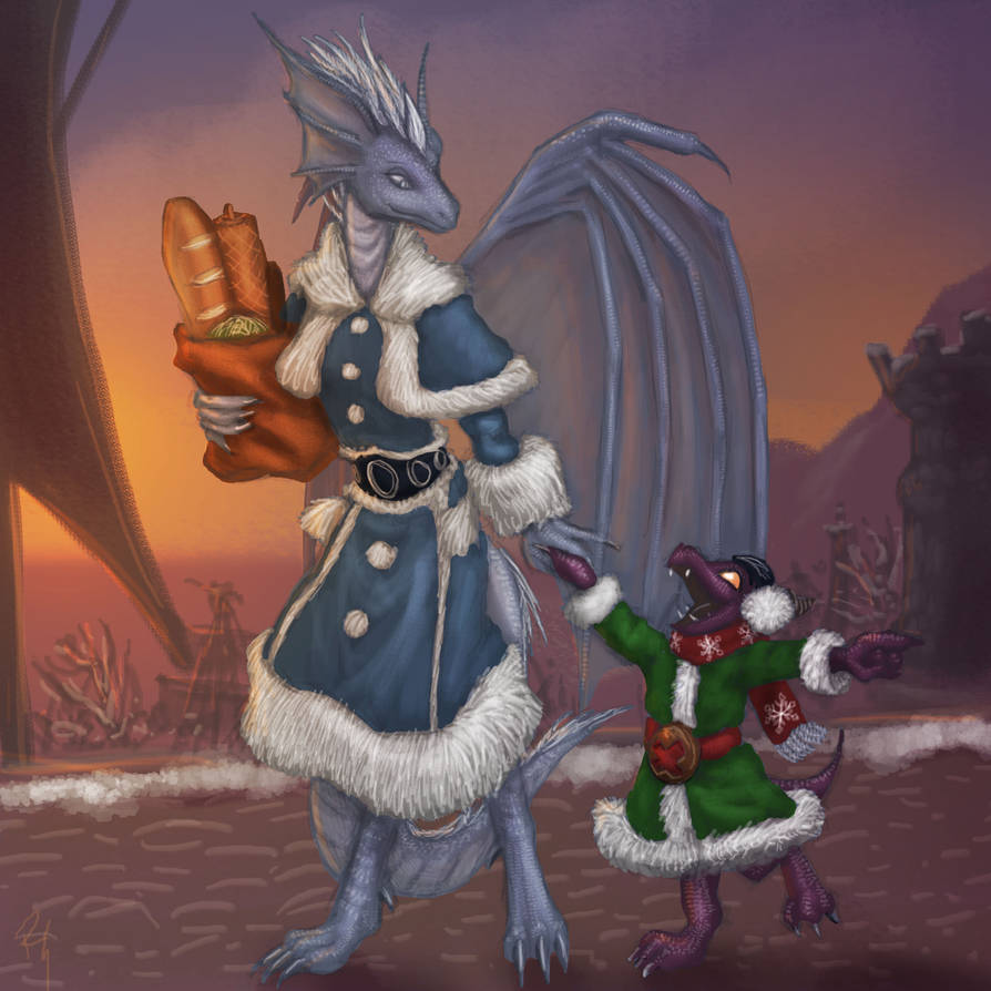 I decided to work in a bit of a "cameo" for a wintry market scene. Here's an imagined dracthyr version of Koogrr's dragon character Cryosanthia, with her adopted daughter Lily (normally a kobold child, but here a little drakonid). Apparently they're doing some winter shopping in Stormwind City, near the harbor.