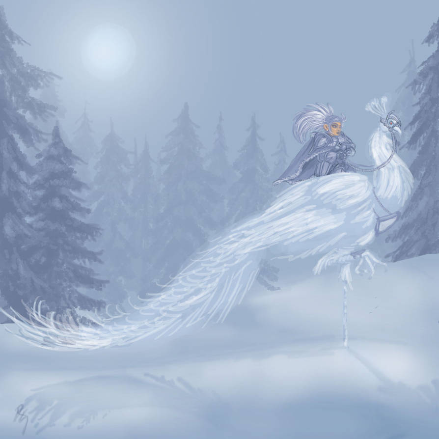 This is a holiday image I drew last year for Koogrr's Pathfinder character, Sister Paenitia Snapdragon (and her battle-peacock, Ramirez). I decided to revisit it to do some touch-up work, and add in something of a background.