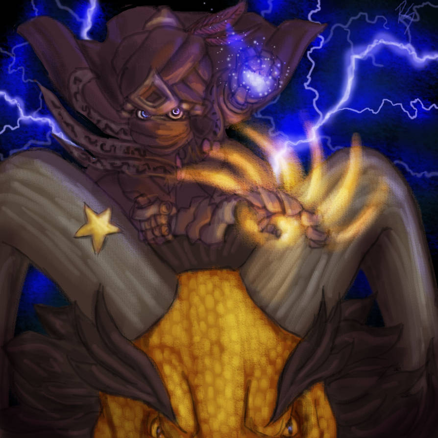 What was supposed to be a dragonrider racing scenario somehow (but really not that surprisingly) turned into a pitched battle with Primalists and a psychotic storm-infused proto-drake. Here, a mecha-gnome mechano-mage prepares to toss a "frost nova" grenade into the heart of the storm in hopes of hitting the proto-drake generating it. Her bronze drake flying partner won a "gold star" earlier for the training class, and proudly displays it on her horn.