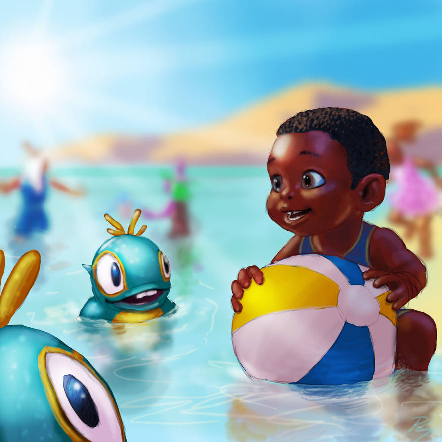 Swimming lessons with (friendly, baby) murlocs at the beach in Westfall. An imagined Children's Week outing to the beach. Another case where I just sort of sloppily, roughly depict a background and BLUR IT OUT LIKE CRAZY.