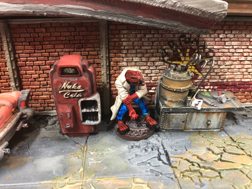 Old HorrorClix miniature from "The Lab" (Repto-Sapien) re-based on a 25mm round base, with some resin and 3D-printed scenery for Fallout: Wasteland Warfare (modified with wire, paper, and bits). I've still got a bunch of these HorrorClix minis around, and several of those from "The Lab" I could easily imagine working to represent various Vault-Tec experiments gone horribly wrong.