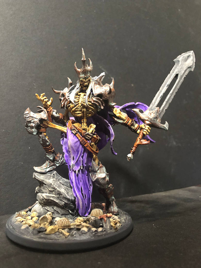 An undead evil overlord type, painted up for my friend's ongoing sandboxy Pathfinder campaign. (Resin 3D-printed figure: "Skeleton King" by CastNPlay.) Dramatic pose and imposing size or no, in my head-canon his name is "Lord Ainz Own-Goal," and this oversized Overlord loves nothing more than to be flattered by his court of overpowered courtiers and general hangers-on. He also suffers from the curse of sounding like Skeletor when he actually speaks. "Nyeh-heh-heh-heh-hehhh!"