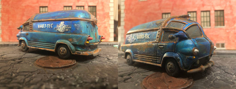 Resin 3D-printed terrain piece from MODIPHIUS for the Fallout: Wasteland Warfare miniatures game, painted up by me in assorted acrylics. I suffered an unfortunate "crackle paint" effect because of (I think) a bit of not-entirely-cured resin on one side of the model reacting badly with the base coat, but since this is post-apocalyptic I decided to just roll with it. Cracked windows, or cracked paint? That works here. A big challenge was with the Vault-Tec logo on the sides, which was part of the model in relief, but frustratingly hard to paint. On the same side that had the crackle-paint issues, the embossed design seemed shallower and "softer," thus requiring a lot of manual touch-up work rather than just mostly relying on dry-brushing.