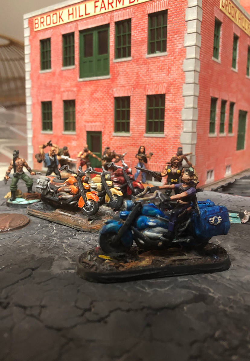 A few copies of the "Lone Highwayman" motorcycle STL from Modiphius (from the Commercial Vehicles set) printed off and based, and a couple modified with custom saddlebag storage. I've been converting and repainting some old Clix (Mage Knight, HorrorClix, IndyClix, and HeroClix) minis as some wastelanders, including (with adjustments) some riders. In the background is an old O-scale building kit I picked up at a local antiques mall (for much cheaper than it would cost me to get a new building model), and the street is a Tablescapes "Urban Streets" terrain tile from Secret Weapon Miniatures.