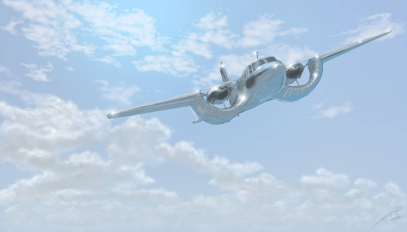 Anyway, that inspired me to try my hand at using one of Gwendel's sky-pictures as a reference to draw some poofy clouds. The airplane is a Custer CCW-5 Channel Wing -- a novelty prototype (it didn't catch on, as it had some severe problems) in a line of attempts to develop a plane that could take off from very short runways. It heavily inspired the design of airplanes found in parts of Fallout: New Vegas ... and it's the sort of bizarre aircraft design that fascinated both me and my dad when we'd see such things at air shows. (For similar reasons, I was a big fan of planes like the VariEze kit-planes that would always be on the flight lines at EAA in Oshkosh, or prototype images of "flying body" planes, etc.)